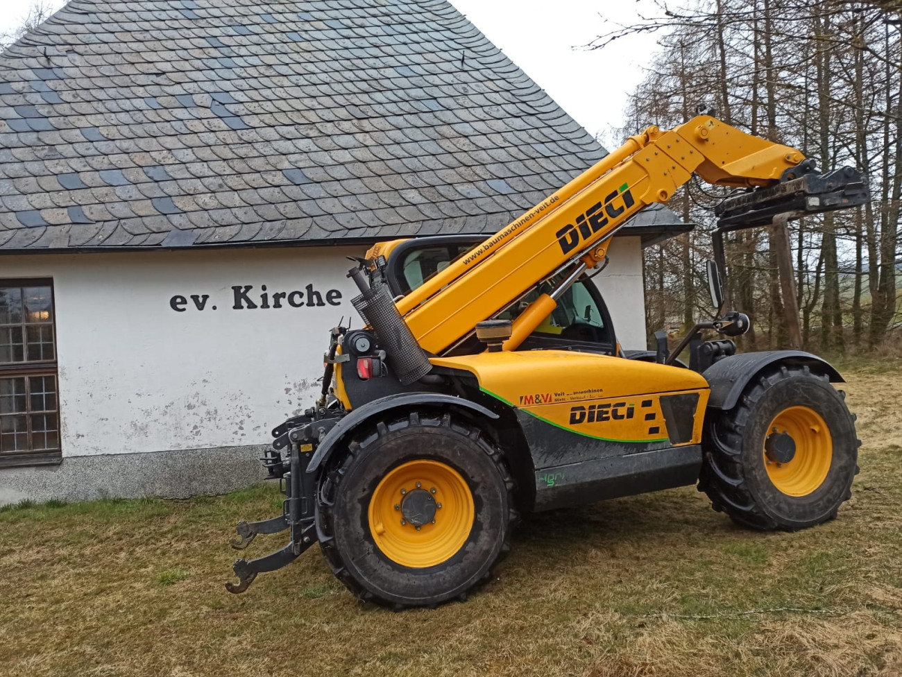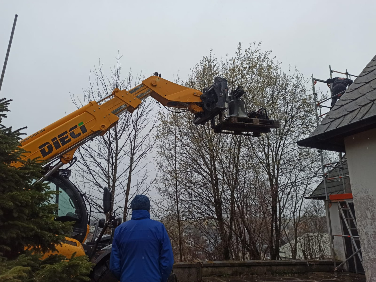 Mit einem Teleskoplader wurde die Glocke aus dem Glockenturm der ev. Kirche, über das gestellte Gerüst nach unten gehoben Pfarrer Sauer bedankt sich beim Technik Team Tettau für die Dokumentation des Geschehens, bei den Fachfirmen sowie beim Bauhof Steinbach am Wald für den professionellen Einsatz bei diesem Sauwetter.